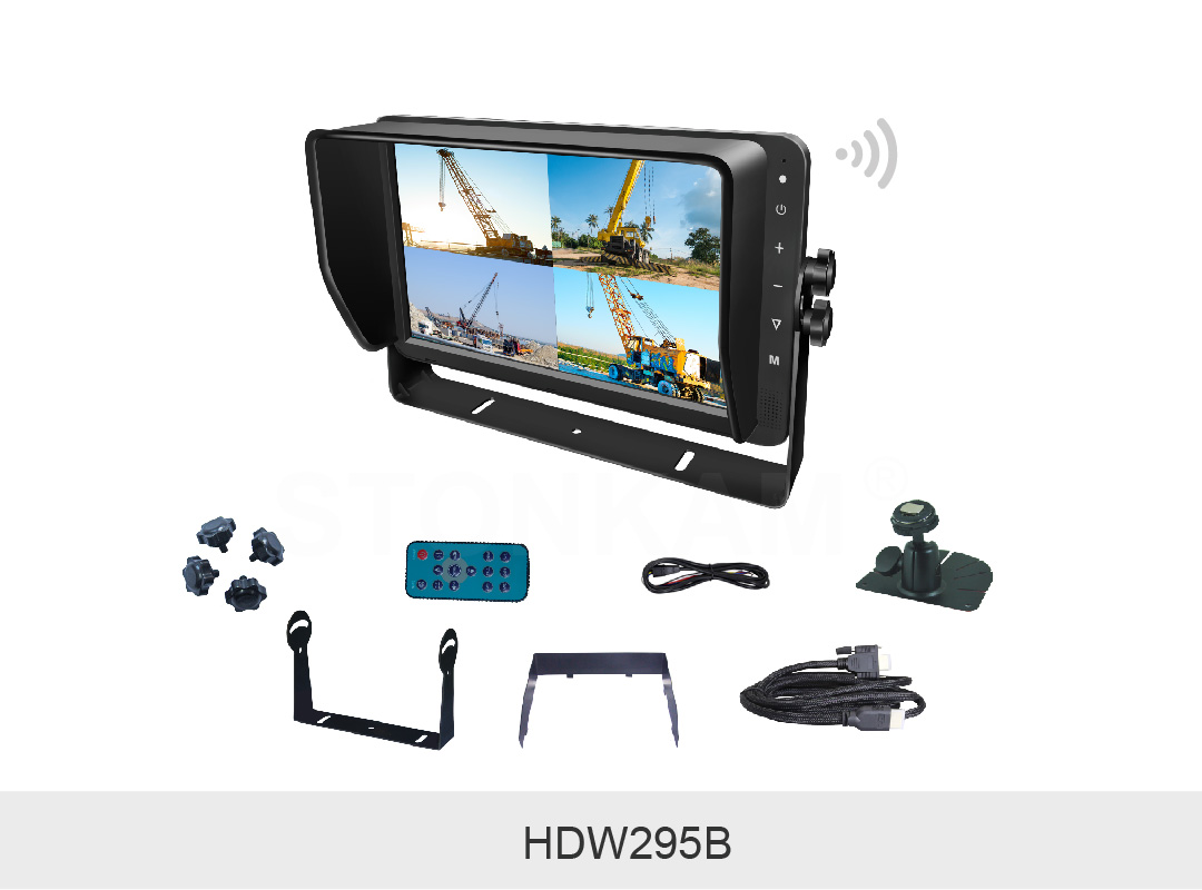 STONKAM 10.1-inch HD digital wireless quad-split monitoring display features wireless connection and easy installation, and supports both video recording and touch screen functions. The open transmission distance is up to 984ft, and the signal is stable and anti-interference. It can be combined with HD wireless cameras to form a perfect HD digital wireless monitoring system, especially suitable for trucks, forklifts, excavators, etc.