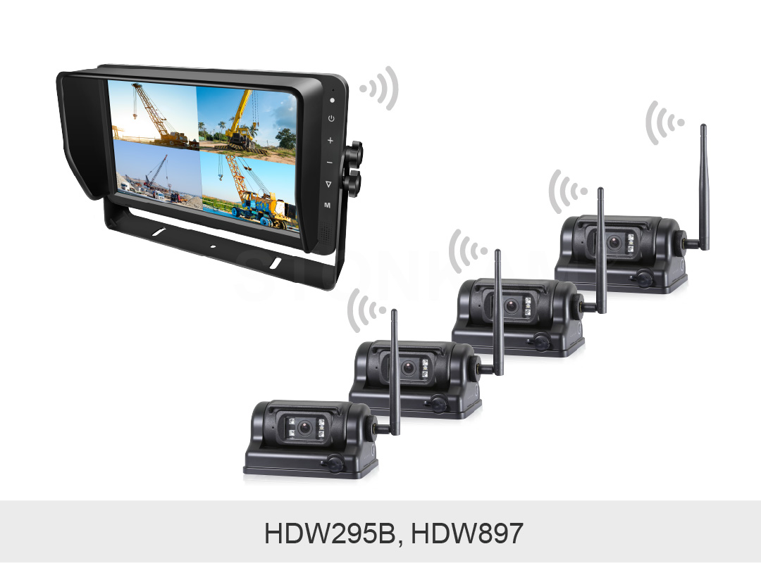 STONKAM 10.1-inch HD digital wireless quad-split monitoring display features wireless connection and easy installation, and supports both video recording and touch screen functions. The open transmission distance is up to 984ft, and the signal is stable and anti-interference. It can be combined with HD wireless cameras to form a perfect HD digital wireless monitoring system, especially suitable for trucks, forklifts, excavators, etc.
