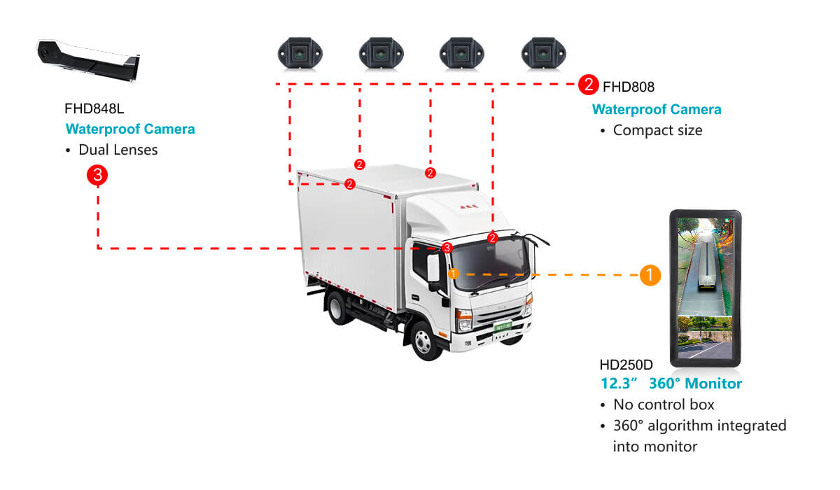 Cameras can be connected to a 360° panoramic display and output via AHD/IPC/CVBS to existing MDVR or dashcams, enabling AI 360° + MDVR functionality , simultaneously supporting dashcam function expansion (DMS & ADAS) to meet multi-scenario application requirements.