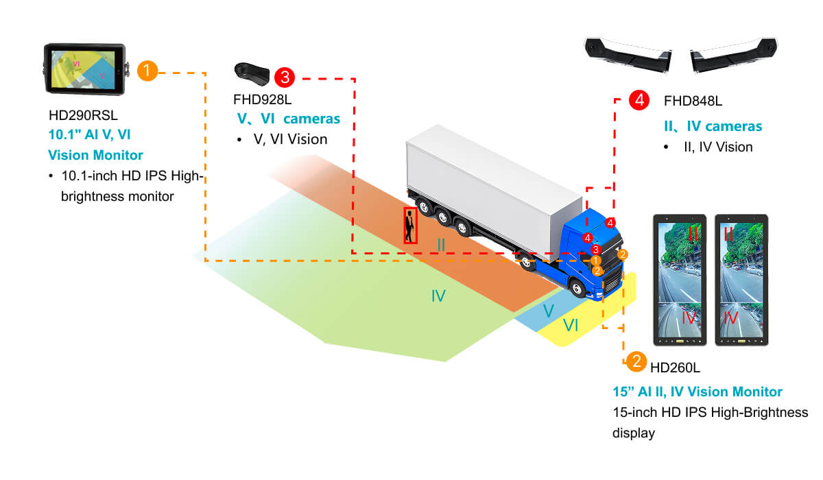The system is compliant with UN ECE R151 and R158 field of vision requirements. It intelligently detects pedestrians and vehicles in front and side-front blind zones, and alerts drivers and surrounding road users through interior/exterior audio-visual warnings to prevent collisions and enhance driving safety.